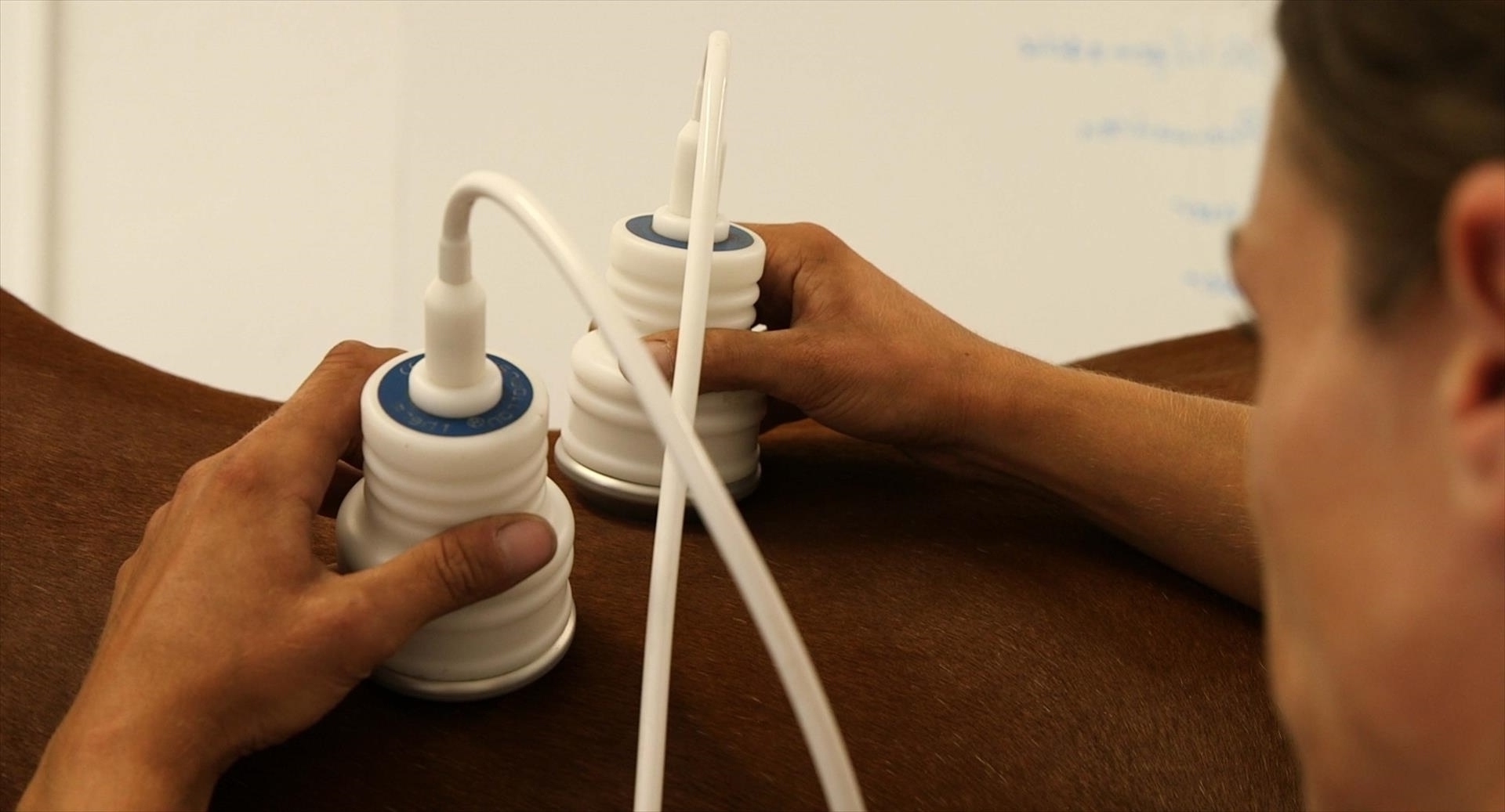 Example: "Kissing Spines", the spinous processes of the spine are alarmingly close together. Pneumatron therapy helps: Daily treatment of the saddle position and the lumbar region with Pneumatron therapy provides relief. The muscle fibres are stimulated, the muscles are built up and kept supple - this prevents the muscle fibres from sticking together at an early stage.